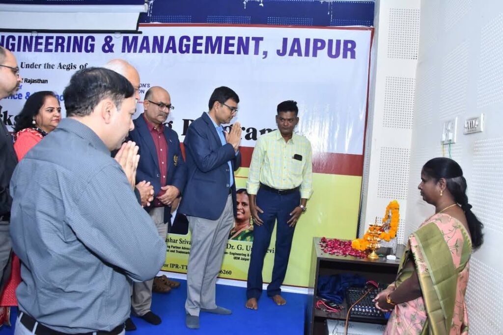 The session commenced with the traditional lamp lighting ceremony, followed by the opening address by Prof. Dr. Biswajoy Chatterjee, Vice-Chancellor, UEM Jaipur. He warmly welcomed all dignitaries and highlighted UEM Jaipur’s achievements in patent filings, emphasizing the role of deep technical knowledge in enhancing patent success.