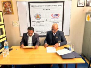 Shri Manas Khawas, Assistant Director, BOAT(NR), Ministry of Education, Government of India and Prof. Dr. Pradeep Kumar Sharma, Registrar and Provost of UEM Jaipur signed and exchanged the MoU in presence of Prof. Ashutosh Gautam, Manager Admission, Mr. Shashikant and other members.