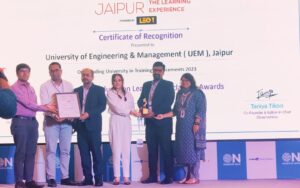 Dr. Ankit Kumar Sharma, Head EE, UEM Jaipur, Dr. Umesh Gurnani, Head ME, UEM Jaipur, Dr. Rahul Sharma, Associate Professor, MBA, UEM Jaipur, and Prof. Jyoti Khandelwal, Assistant Professor, CSE, UEM Jaipur attended the conclave and received the award on behalf of the University.