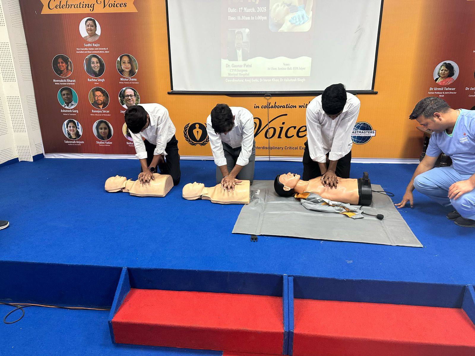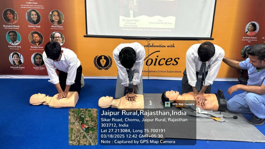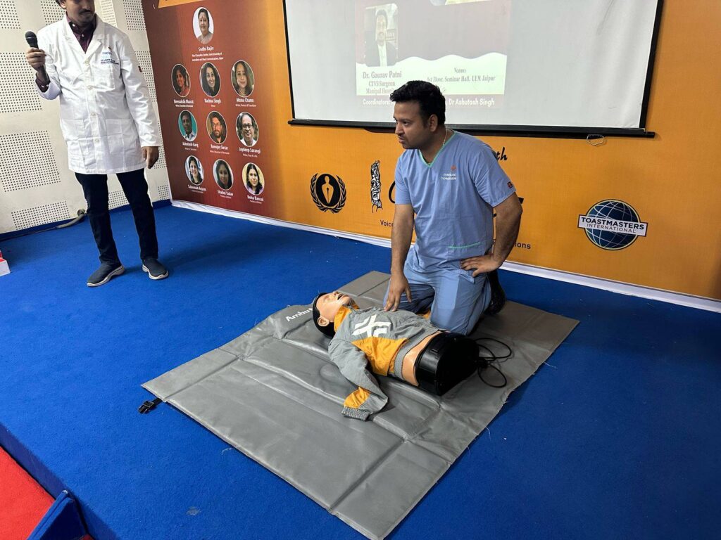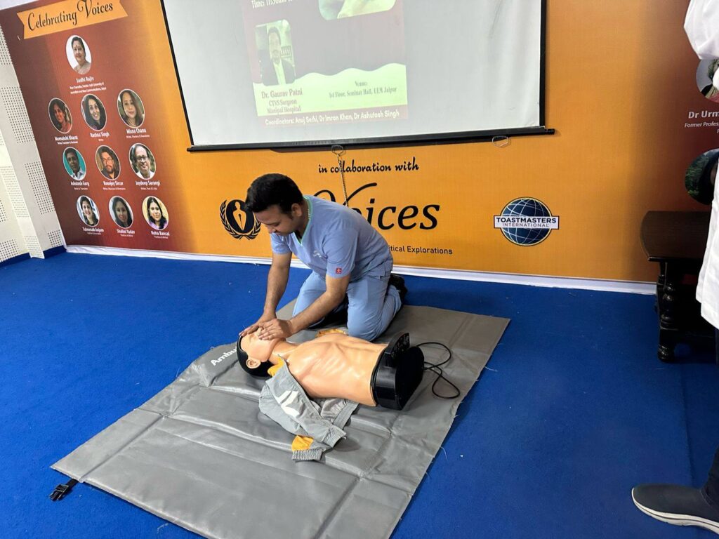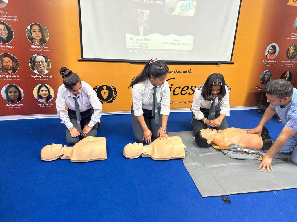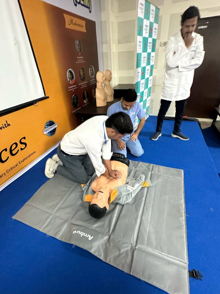 The workshop aimed at equipping our students with critical life-saving skills and emergency response techniques. We were honoured to have Dr. Gaurav Patni, renowned CTVS Surgeon from Manipal Hospital, as the resource person for the session. His expert guidance and hands-on training provided participants with a comprehensive understanding of CPR and its real-world applications.