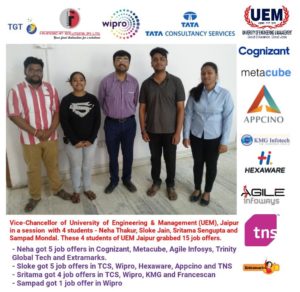 Vice-Chancellor of the University of Engineering & Management (UEM), Jaipur, Prof. Dr. Biswajoy Chatterjee in a session with 4 students of the University – Neha Thakur, Sloke Jain, Sritama Sengupta and Sampad Mondal. These 4 students of UEM Jaipur got 15 job offers.
