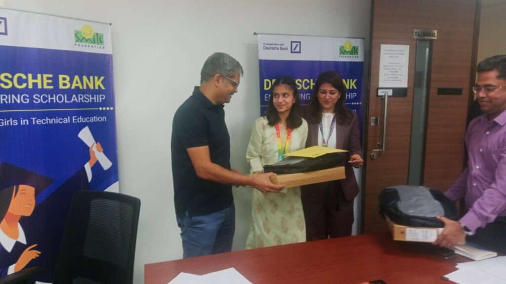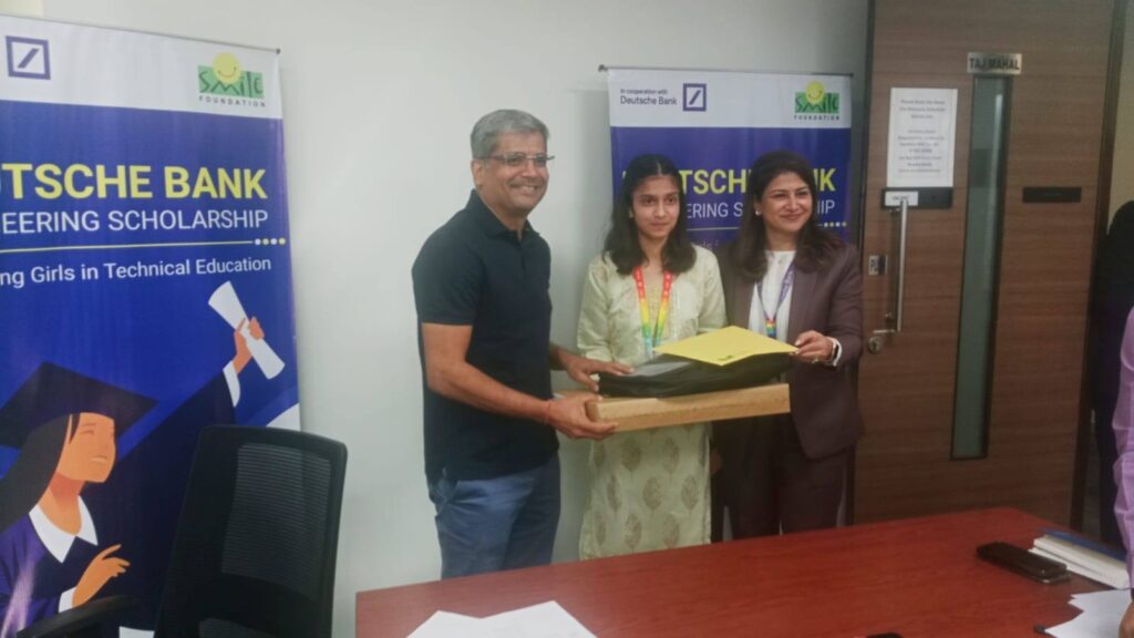The felicitation ceremony was held at the Deutsche Bank Jaipur office, where Dilip Khandelwal (CEO – Deutsche India), Simriti Sharma (Managing Director, Deutsche Bank), and Manish Bansal (CSR Head, Deutsche Bank) presented the scholarship recipients with an official Letter of Scholarship Grant and an HP laptop. The event was attended by the students’ guardians and representatives from their respective institutions, celebrating this significant achievement.