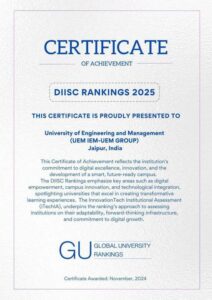 We are so proud and happy to state that out of more than 51,000 universities across the world, UEM JAIPUR has been globally ranked in GOLD+ category in Global University rankings in DIISC (Digital Institutional Index and Smart Campus). Only 1080 universities across the world have received any ranking in this, and only 10% of these have been placed in GOLD category. This ranking indicates our University’s digital innovation and smart campus capabilities – adoption of technology and commitment to creating digitally advanced future-ready campuses. We are thankful to our students, and all our faculty members for their contribution in achieving this excellence.