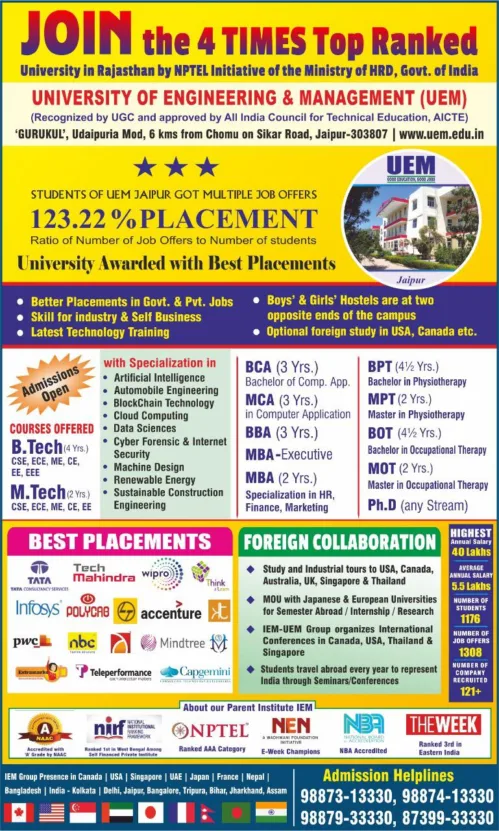 University of Engineering & Management (UEM), Jaipur – is the Topmost ranked (ranked 1st) institute of Rajasthan by NPTEL, Ministry of HRD, Govt. of India – is the Topmost ranked (ranked 1st) institute of Jaipur by The Times of India – Times Higher Education (THE) ranking – is a University, whose students have achieved 123.22% … Continued