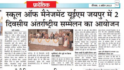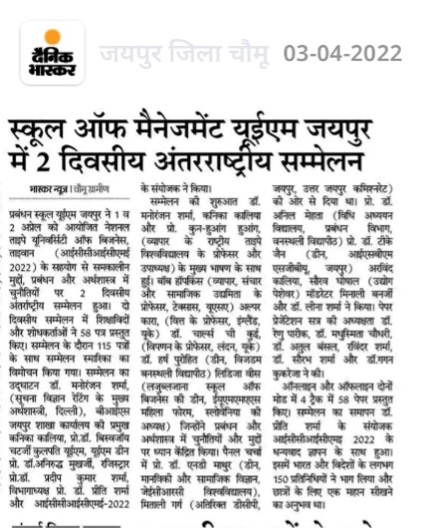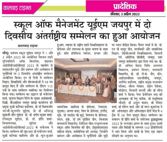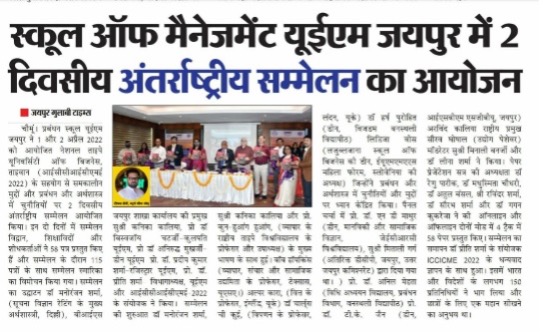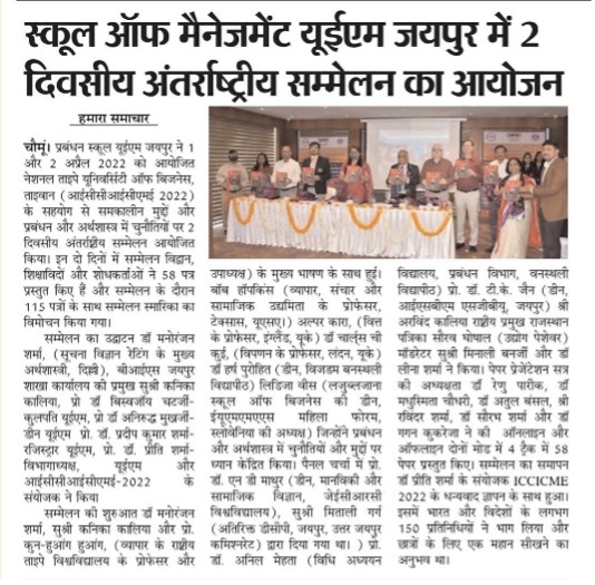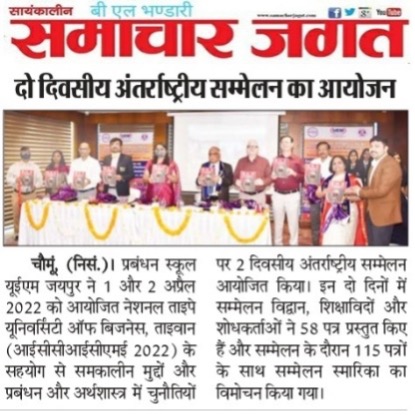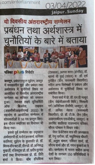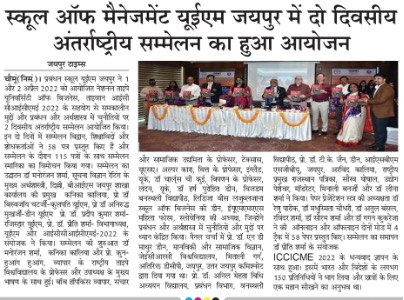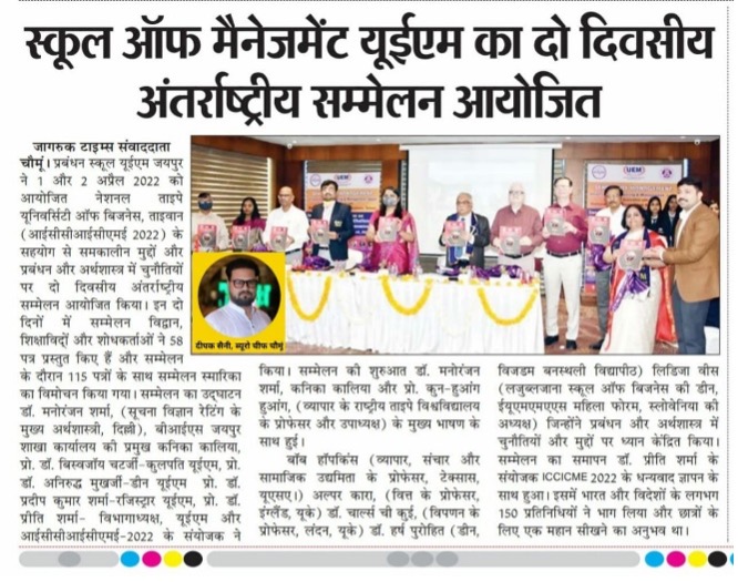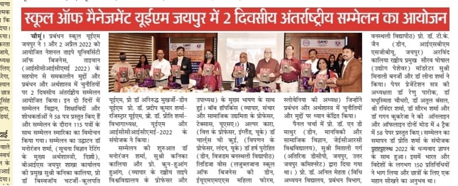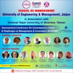 The 1st UEM two days INTERNATIONAL CONFERENCE on CONTEMPORARY ISSUES and CHALLENGES in MANAGEMENT and ECONOMICS (ICCICME – 2022) brought the avid Scholars, Practitioners, Academicians and Industry Experts on a single platform to cater the novel paradigms and focus on the pertinent research problems in the area of Economics, Finance and Management. The conference was an instrumental for avid Researchers, Academicians, Industry experts and Students. School of Management UEM Jaipur in association with National Taipei University of Business, Taiwan has organised 2 days INTERNATIONAL CONFERENCE ON CONTEMPORARY ISSUES AND CHALLENGES IN MANAGEMENT AND ECONOMICS (ICCICME 2022) Date: 1st & 2nd April 2022 Publication in Scopus, ABDC Journals and UGC care list journals. Website: iccicme.uem.edu.in