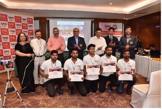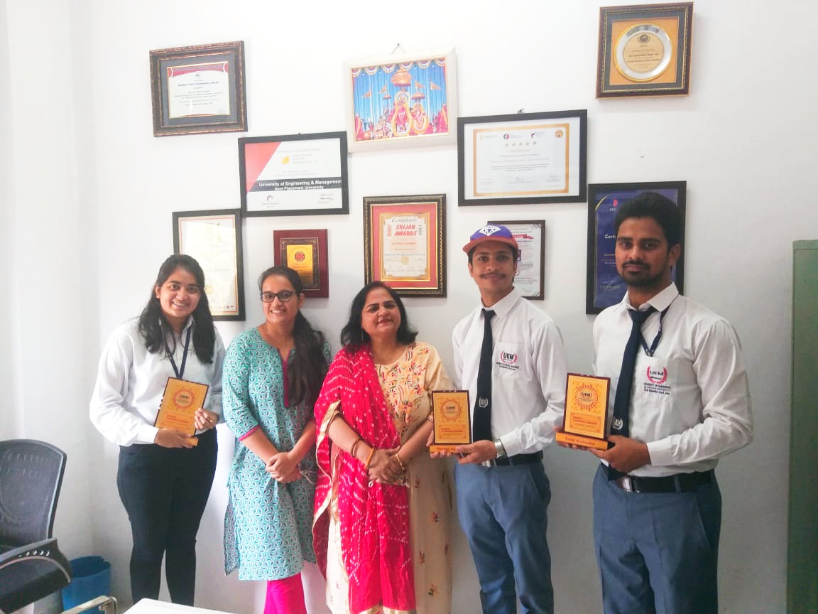School of Management UEM Jaipur. Students of MBA 1st year Pratima Mishra & Sanjana Singh developed E- shoes for self defense. In this they have put an electric pulse generator to produce upto 2Kv of electric plus. Moreover it consists of 3.7volt lithium ion rechargeable battery along with built -in charging unit. Two LED indicator for ON/OFF indication and charging status. Charging port available on side of shoe to charge it up. It is very useful for Female travelling alone.