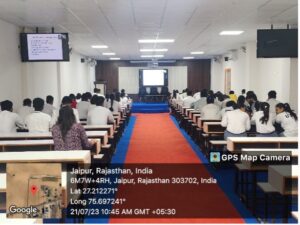On October 18, 2023, the MBA – Hospital and Healthcare Management (HHM) students embarked on a valuable industrial visit to Eternal Hospital in Jaipur. Dr. J N Singh, Associate Professor, Mr. Anuj Sethi, Corporate Relationship Manager, Mr. Aplav Saxena, Guest Faculty, and Abhishek Choudhary, Manager at Eternal Hospital, accompanied the students during this insightful visit. The interaction provided students with a profound understanding of the intricacies of the hospital industry, offering a real-world perspective on the operational aspects and management strategies employed in healthcare establishments. The cooperative engagement from the management of Eternal Hospital is commendable, as it facilitated a meaningful learning experience for the students. This industrial visit served as a bridge between classroom learning and practical application, enhancing the students’ knowledge and readiness for future roles in the dynamic field of Hospital and Healthcare Management. We extend our gratitude to all participants and the management of Eternal Hospital for their collaborative efforts in making this industrial visit a success.