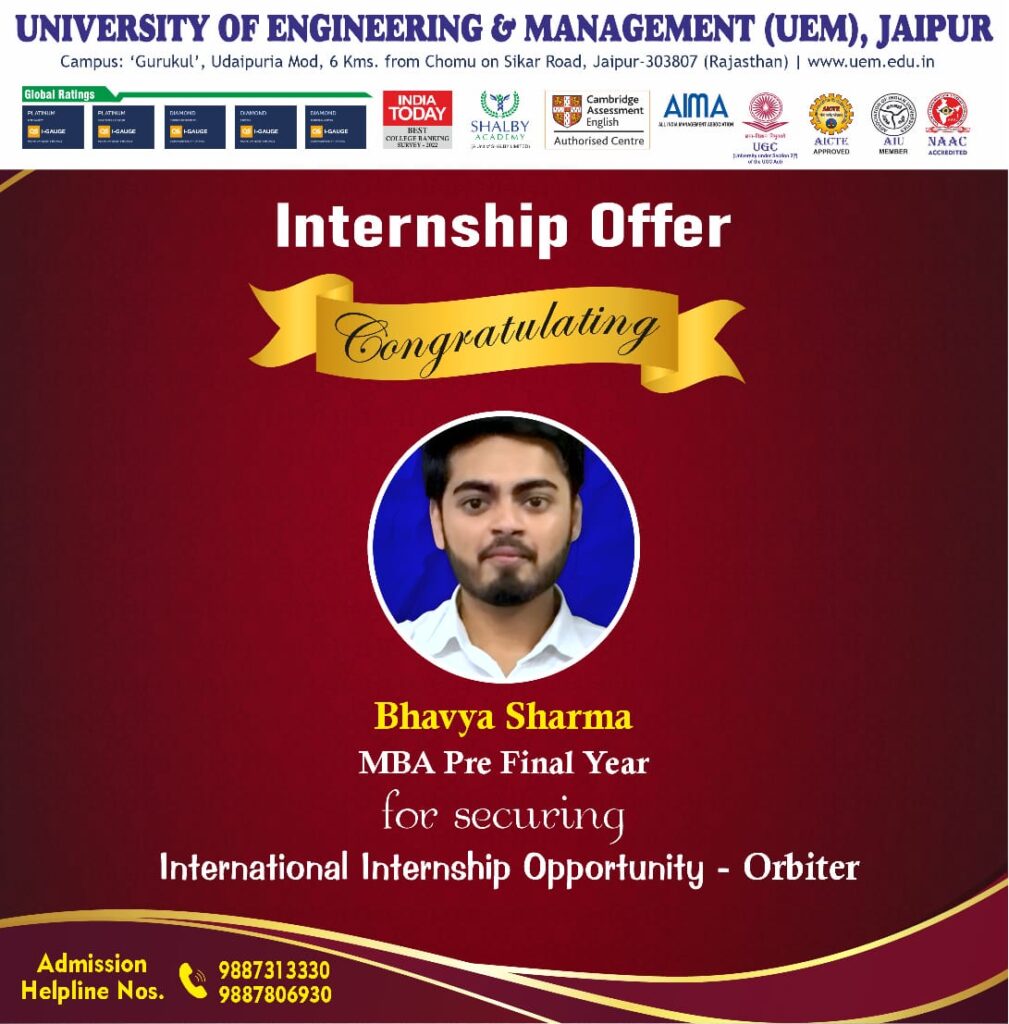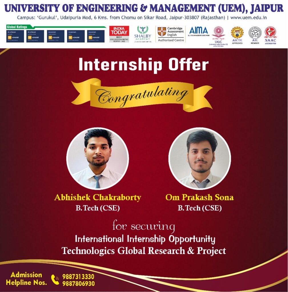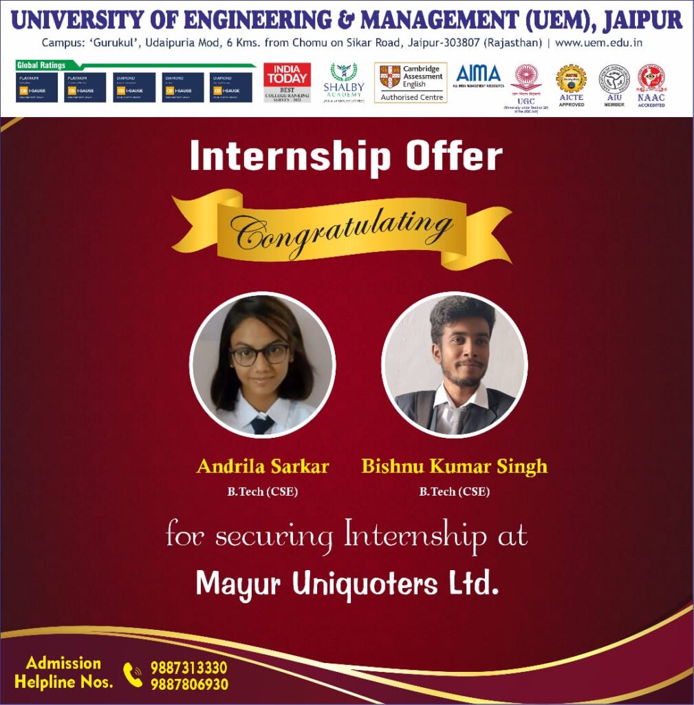 In 2022, UEM JAIPUR has ranked in 2nd position in entire North-Western India, under the Institutions Innovation Council (IIC) by the Ministry of Education, Govt. of India.