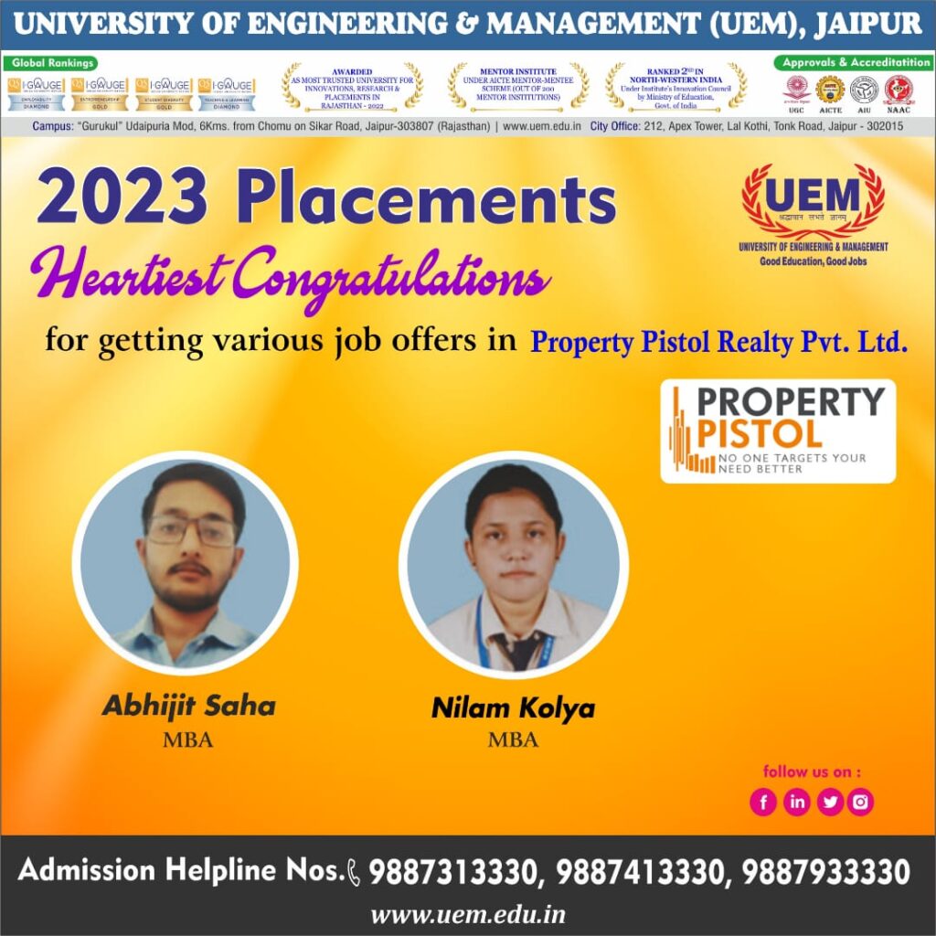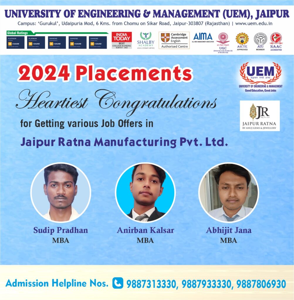 - 2024 passing out students of UEM JAIPUR are acquiring job offers on a daily basis, and their placements are being continued to ensure satisfaction of the last student. 2025, next year to be passing out students of UEM JAIPUR are the first set of students in the country, to be acquiring pre-placement offers.