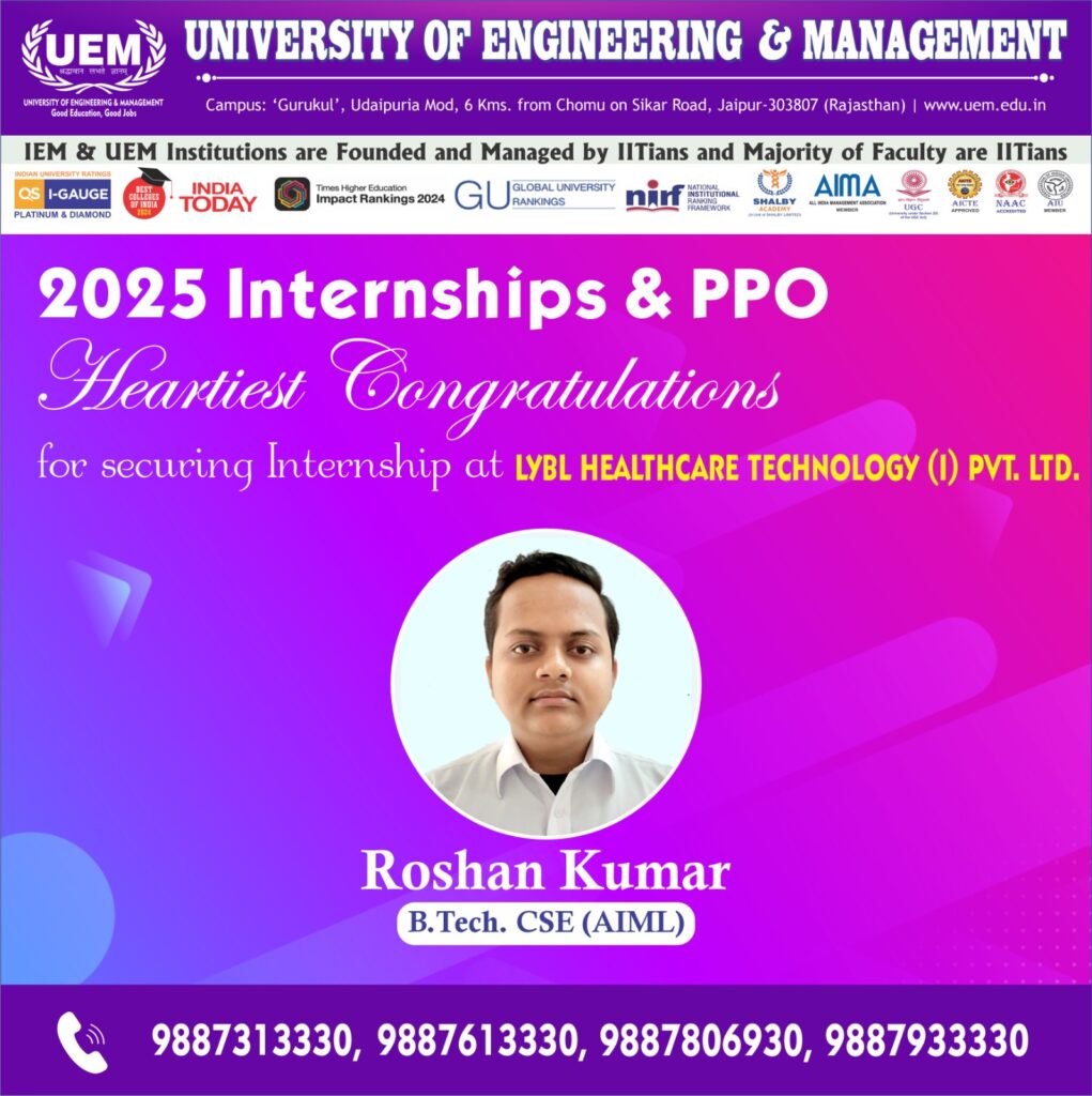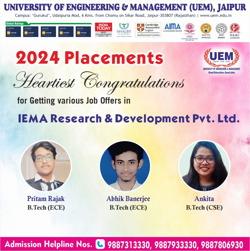 - Placement at University of Engineering & Management (UEM), Jaipur continues till the last willing student is placed.